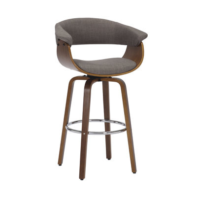 Create an accountThis swivel bar stool gives you a range of motion, so it's a cinch to turn to snacks at the bar or to the nearest conversation. A bucket-style seat features a cutout opening in the back for a sleek mid-century modern vibe. Made from solid wood in a warm walnut hue, it rests on four slightly tapered legs and a circular footstool crafted from weathered steel. The seat and curved back are upholstered in neutral-toned fabric and filled with foam to provide just the right amount of support as you enjoy your beverage of choice. This stool has a weight capacity of 265 lbs.