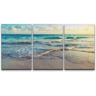 Coastal Beach Sunrise On Ocean Waves Crashing Artwork Soft Blue-Green Modern Beachy Decor Wall Pictures Framed Canvas Giclee Print 3 Pieces Wall Art 16x24x3 pcs 24x36x3 pcs
