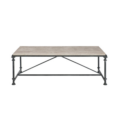 Create an accountA timeless classic, the Galesbury cocktail table blends a unique mix of materials in its architectural design. Crafted from solid and tubular steel in an antique silver finish, the sleek base features slender, shapely legs reminiscent of columns. The stretchers form a triangle that leads the eye to a rectangular travertine stone top. The smooth, cream-colored stone lends natural beauty and luxurious allure.