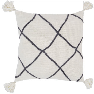 Create an accountNeutral + bohemian. Drawing inspiration from Moroccan weaving motifs, this throw pillow cover showcases a geometric diamond pattern in white + charcoal gray. A nubby texture and tasseled corners layer eclectic texture into your space, and it arrives with your choice of insert.